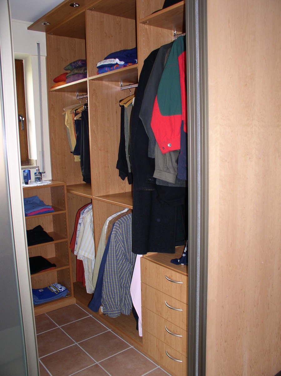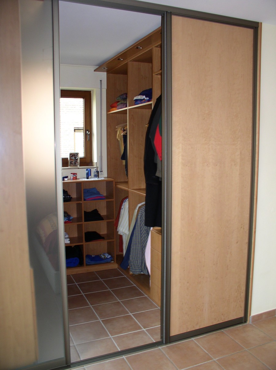 Was würden Sie mit einer großen Nische im Raum machen? Unsere Kunden wünschten sich einen begehbaren Kleiderschrank! Dieser begehbare Kleiderschrank sollte hell und offen sein, und auch als Ankleidezimmer dienen. Die Helligkeit im Ankleidezimmer wird durch das Fenster, die lichtdurchlässige Verglasung in der Schiebetür sowie die helle Beleuchtung gewährleistet. Die offene Gestaltung bringt auch eine offene Optik mit sich. Das ist in Ordnung, wenn gerade die passende Kleidung ausgewählt wird. Aber danach soll der offene Schrank doch möglichst wieder unsichtbar sein. In diesem Beispiel haben wir das mit einer praktischen Schwebetür gelöst. Diese passt exakt zur Raumnische – von Wand zu Wand und vom Boden bis zur Decke.