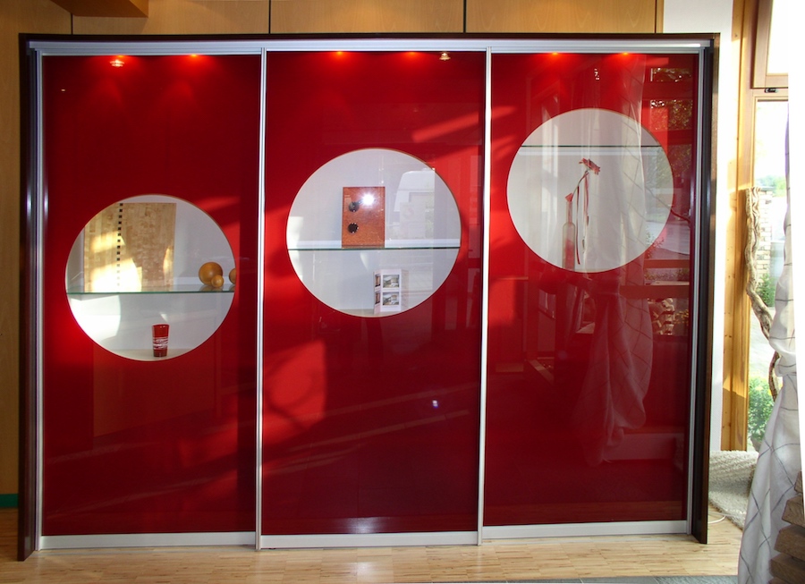 Ein passender Schrank mit Schiebetüren aus Glas in roter Lackierung – exakt in den Raum passend. Das war der Wunsch dieses Kunden.