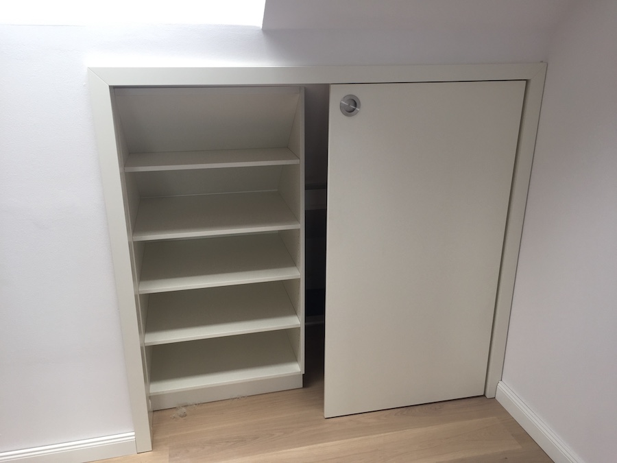 Ein Drempel bietet viel zusätzlichen Stauraum, dabei unterstützt eine sinnvolle Aufteilung des Stauraums und eine einfache Zugangsmöglichkeit. Die Kunden in diesem Beispiel haben einen passenden Schrank zum Einbau in ihren Drempel bekommen. Dieser ist über eine praktische Schiebetür zu erreichen.