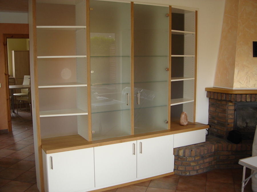 Die Kinder sind schon groß, wohnen aber noch im gemeinsamen Haus. Dazu gehört auch, dass sie dann das Haus verlassen und betreten, wann es ihnen passt. Im Haus unserer Kunden fiel dann der Blick der Kinder direkt von der Haustür ins gemeinsame Wohnzimmer. Damit die Eltern dort gemütlich und blickgeschützt sitzen konnten, haben wir eine -von beiden Seiten aus als Schrank nutzbare- Wohnwand nach Maß eingebaut, welche gleichzeitig als Raumteiler dient. Dieser ist blickdicht, durch das Milchglas aber lichtdurchlässig- für ein helles Raumklima im Wohnzimmer. Besonderheit bei dieser geräumigen und modernen Wohnwand ist, dass sie exakt über den Vorsprung des offenen Kamins gebaut wurde – individueller geht es nicht mehr! Weitere Besonderheit ist die Zimmertür zwischen Wand und Wohnwand – hier handelt es sich um eine sogenannte Pendeltür, sie öffnet in beide Richtungen. Das ist ein sehr praktisches und komfortables Detail.