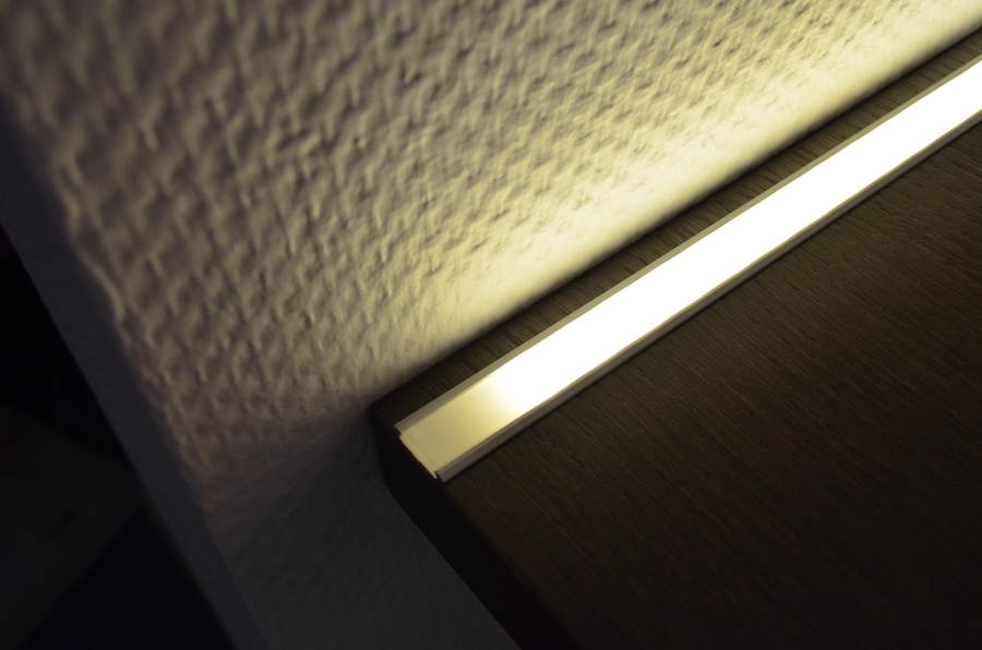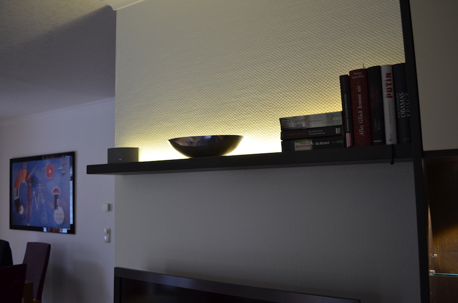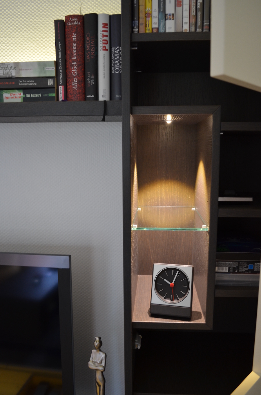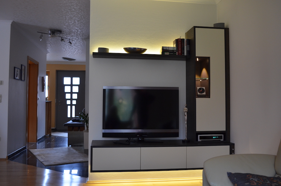 Früher stand an der Stelle, wo wir exakt auf die Wand passende Wohnwand aufgebaut haben, ein klassischer Phono-Wagen mit großer CD Sammlung und Hi-Fi-Anlage. Dieser war offen, also gut zugänglich. Allerdings auch sehr reinigungsintensiv, konnte nicht versteckt werden. Dazu sollte es eine Lösung geben. Anforderung: Die CD Sammlung soll einfach und bequem verschwinden können, staubgeschützt sein und dabei gut zugänglich und übersichtlich sein. Alle Hi-Fi-Geräte sollten in den Schrank, inklusive Kabelführung. Zudem sollte die eigentlich „dunkle“, weil fensterlose Ecke mit einer gemütlichen Ambiente-Beleuchtung aufgehellt werden. Wichtig war auch, dass der schon vorhandene Couchtisch farblich zur neuen Wohnwand passt.