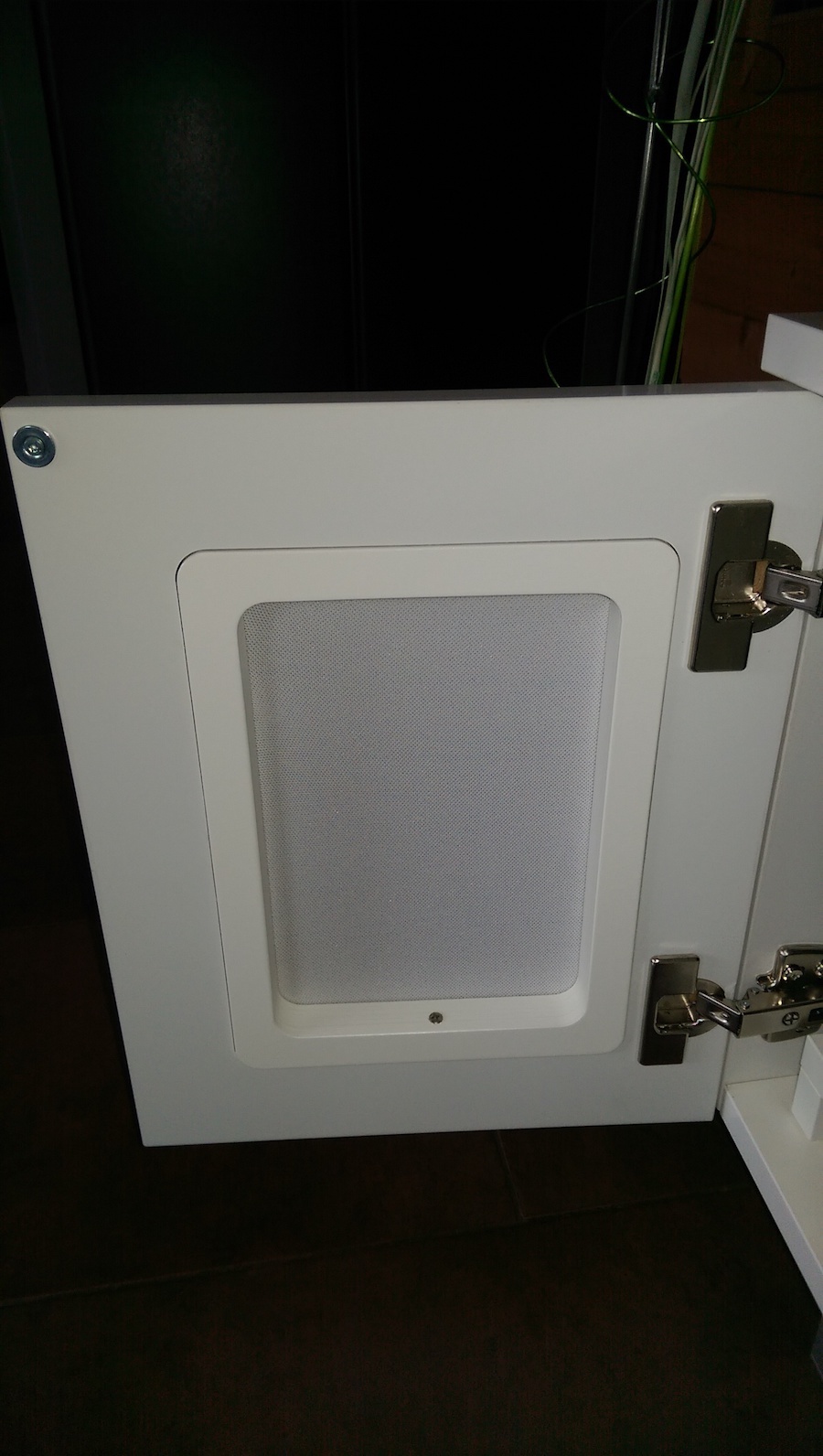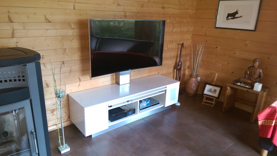 Ein Holzhaus ist etwas sehr Wohnliches und Gemütliches. Allerdings sind auch ein paar Besonderheiten zu beachten, beispielsweise dass an den Wänden keine schweren Gegenstände, etwa ein großer Flachbildschirm, aufgehängt werden können. Kundenwunsch war es aber, dass der Flachbildschirm so aussehen sollte, als wäre er an der Wand aufgehängt. Dazu haben wir ein spezielles TV-Möbel mit einem stabilen TV Halter aus Edelstahl gebaut. Die im Möbel befindlichen Hi-Fi Geräte können komplett versteckt werden. Die Lautsprecher befinden sich hinter den Schranktüren, welche mit Boxenstoff bespannt sind. Die Türen können somit auch h bei Nutzung der Musikanlage geschlossen bleiben. Zur einfachen Bedienung ist das Fach in der Mitte geöffnet, kann aber auch einfach und bequem mit einer im Schrank verstauten Holzklappe versteckt werden.
