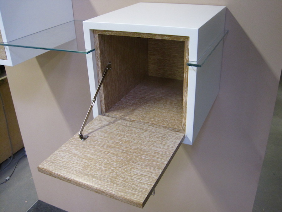 Dies ist das Gesellenstück unseres ehemaligen Auszubildenden Stephan Eberz. Ein optischer Hingucker mit Ablage aus Glas und zwei kleinen Schränkchen.